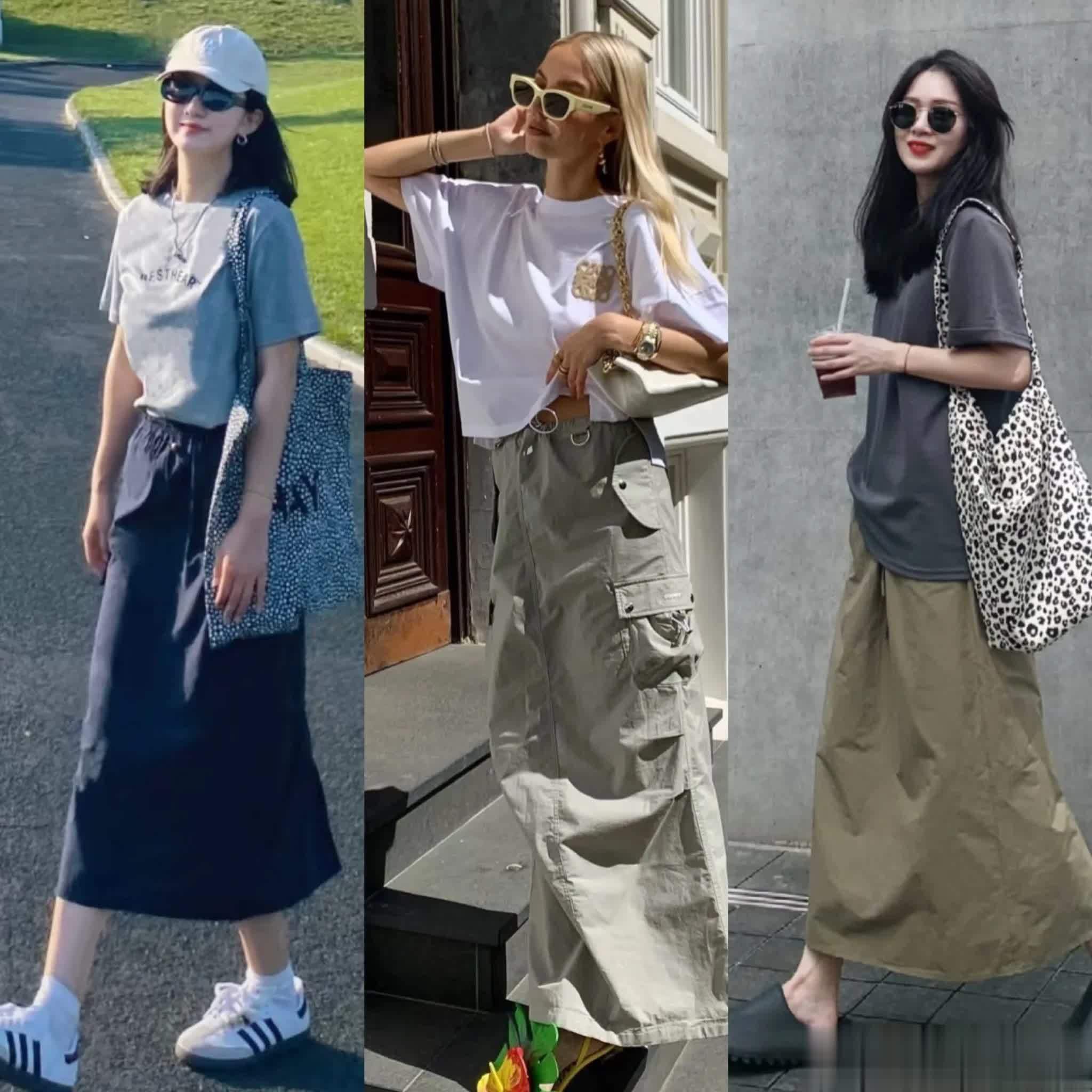 保守的女生,可以给自己准备一件大一号的T恤衫来搭配工装直筒裙,那种慵懒惬意的休闲风格,有种自由自在的腔调,特别适合夏日旅行时穿,又带着硬朗帅气的感觉,够A够飒又轻松洒脱。