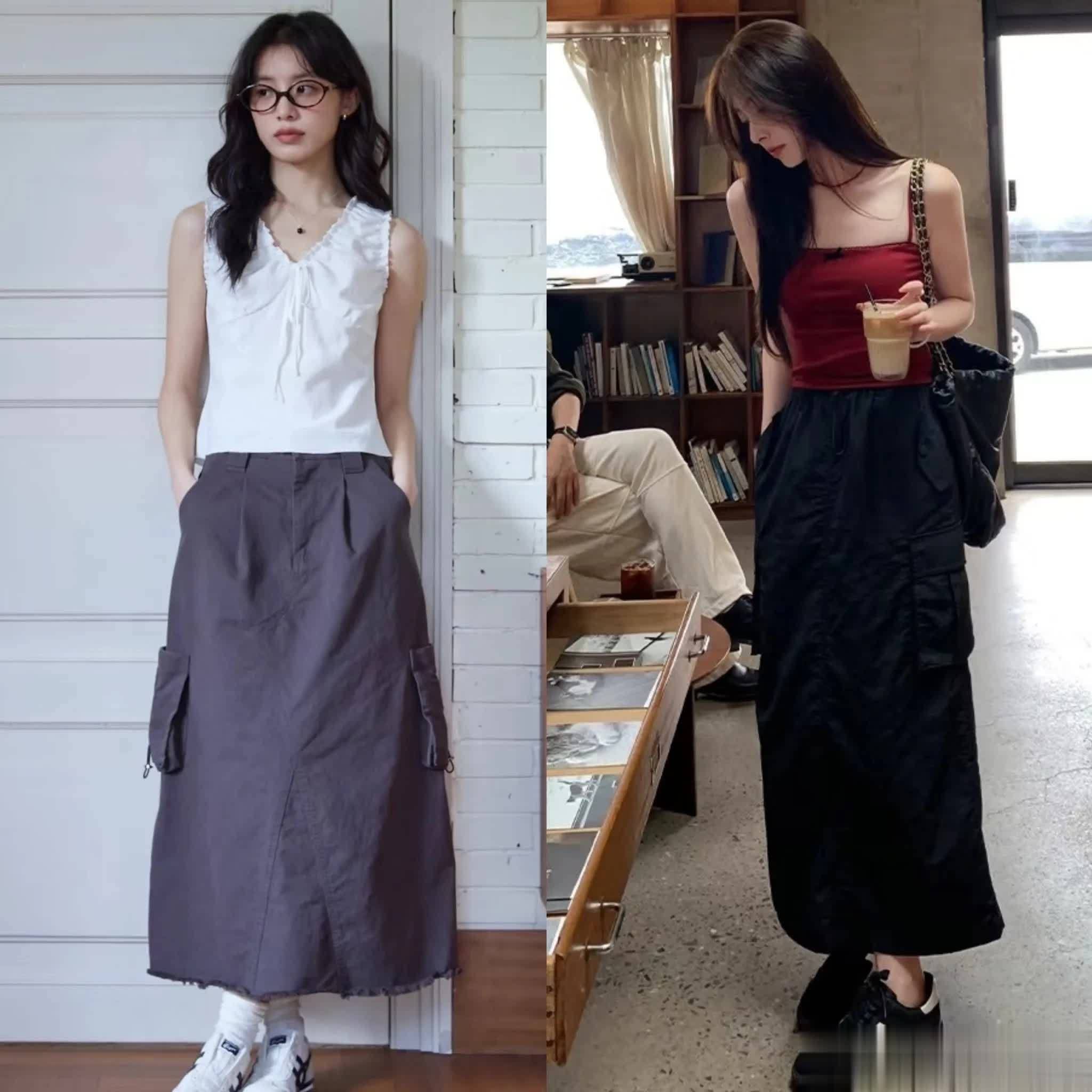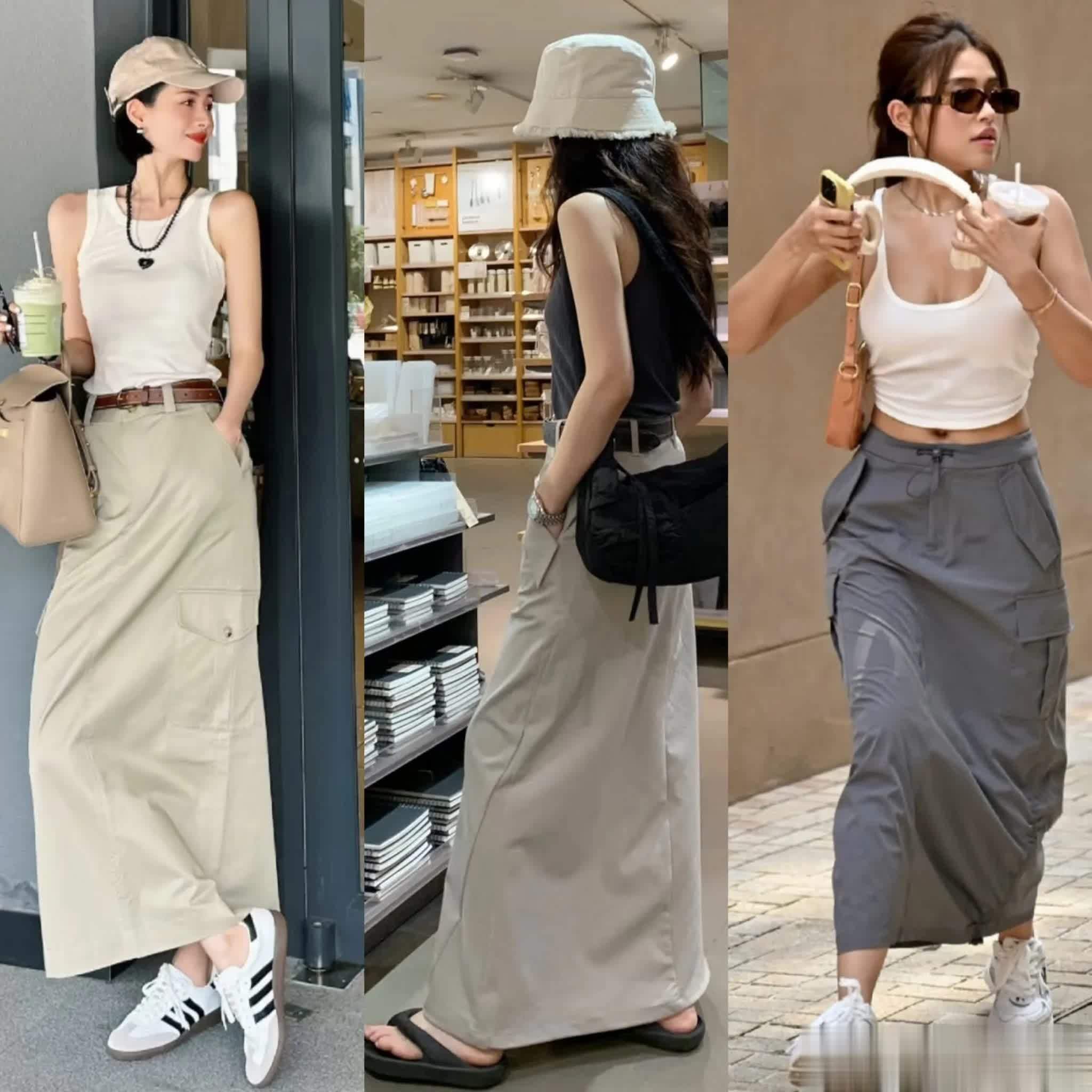 夏天可以太喜欢背心+工装直筒裙的搭配了,又飒又美。