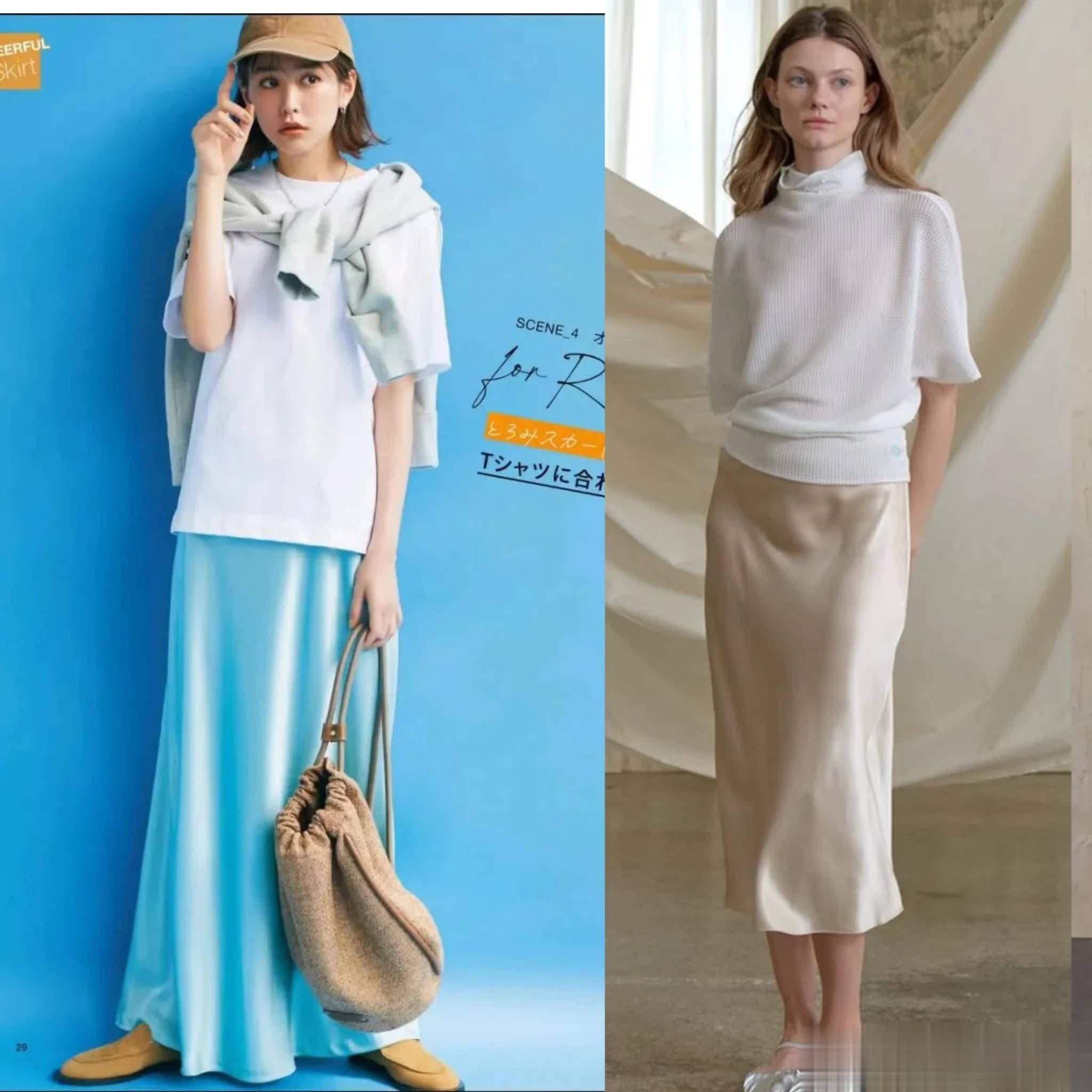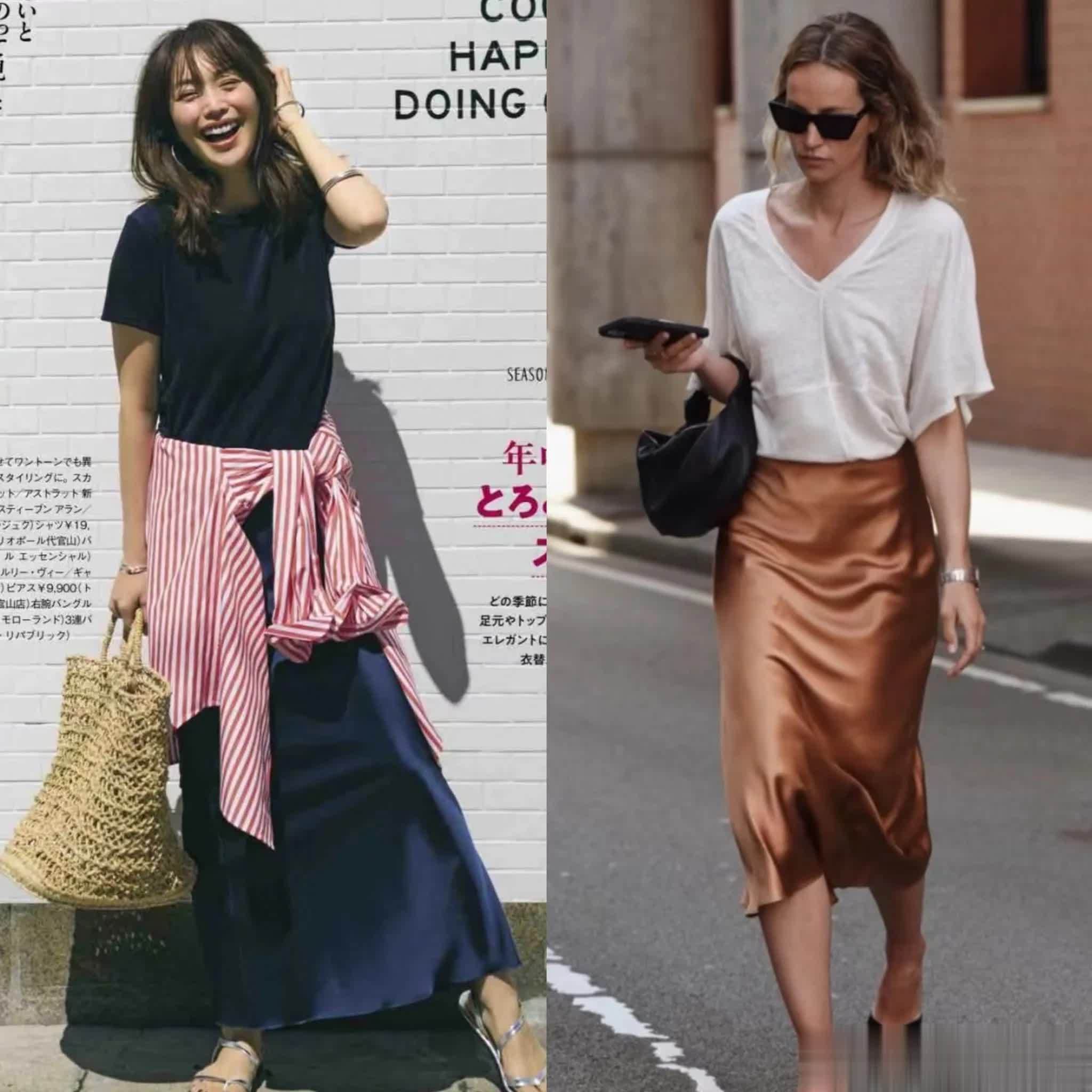 日常生活中,简单的白T可以搭配彩色缎面长裙,带着些慵懒随性的氛围感,同时干净的配色又彰显出青春的活力与朝气,减龄效果很OK。
