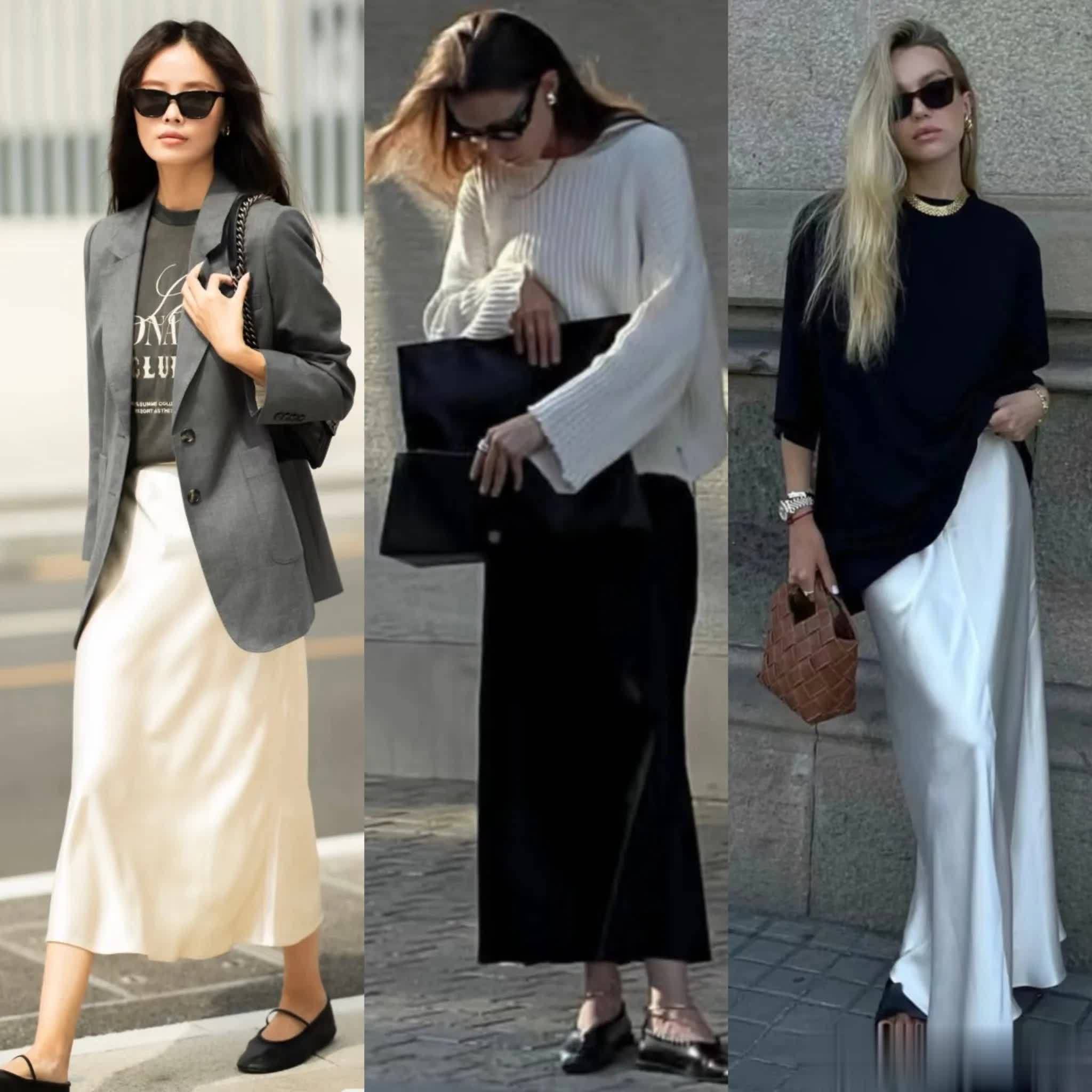 薄款的白色针织衫,搭配黑色缎面裙,黑白配色自带高级感,同时又得体大方,上班穿气质爆棚。